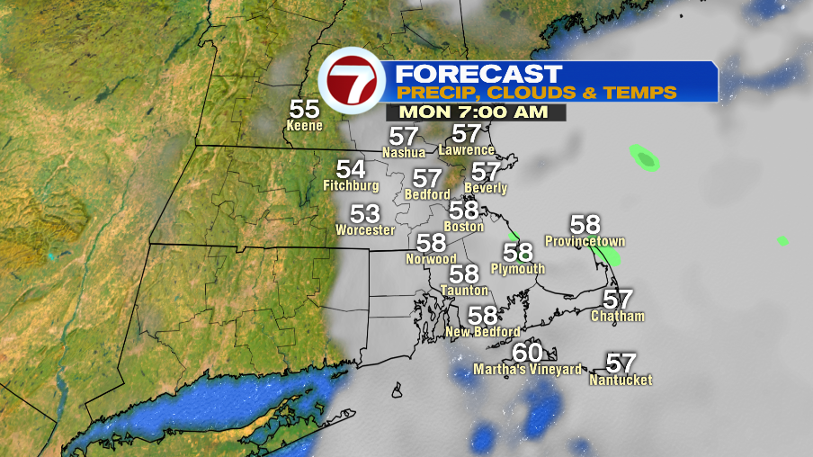 Monday starts with cloudy skies and temperatures in the 50s. Most of the morning is cloudy, and then it gradually clear in the afternoon. Highs are in the low 70s inland, and near 65º at the coast.