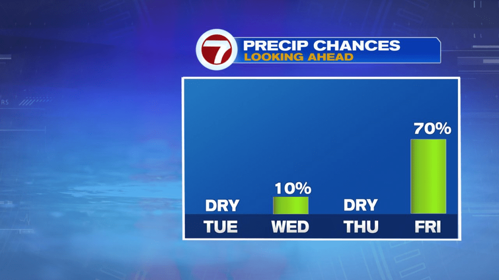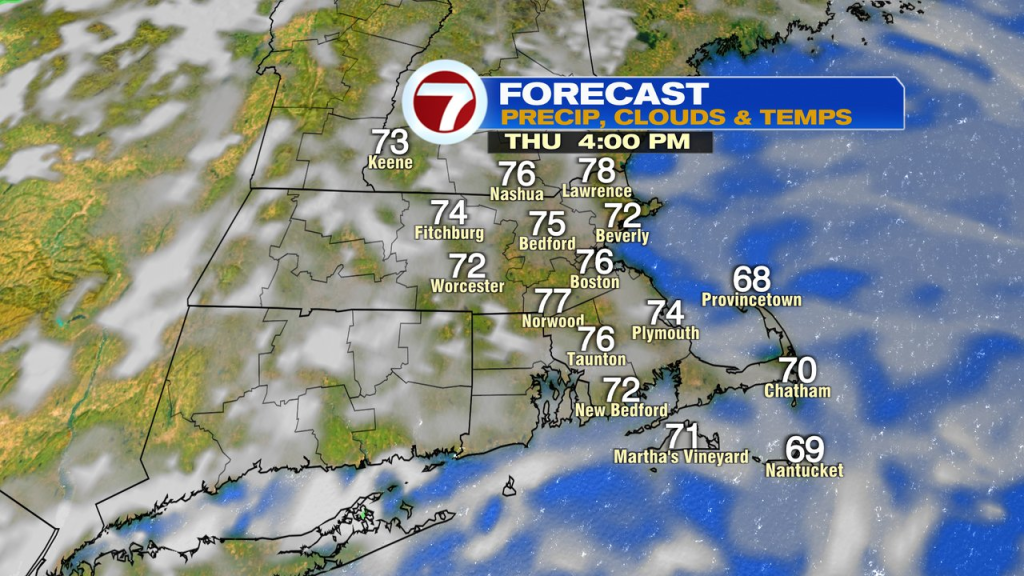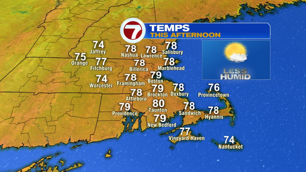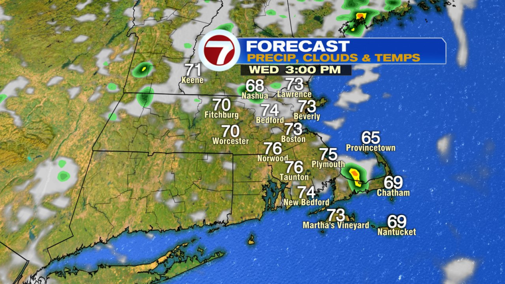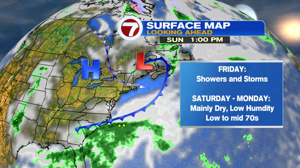 That system is offshore Saturday with any early morning shower tapering off quick. Much of the weekend is dry, and a bit below average for the time of year, with highs in the low to mid 70s. Scattered showers will still be possible across the higher terrain of northern New England, so keep that in mind if your weekend takes you up north.
