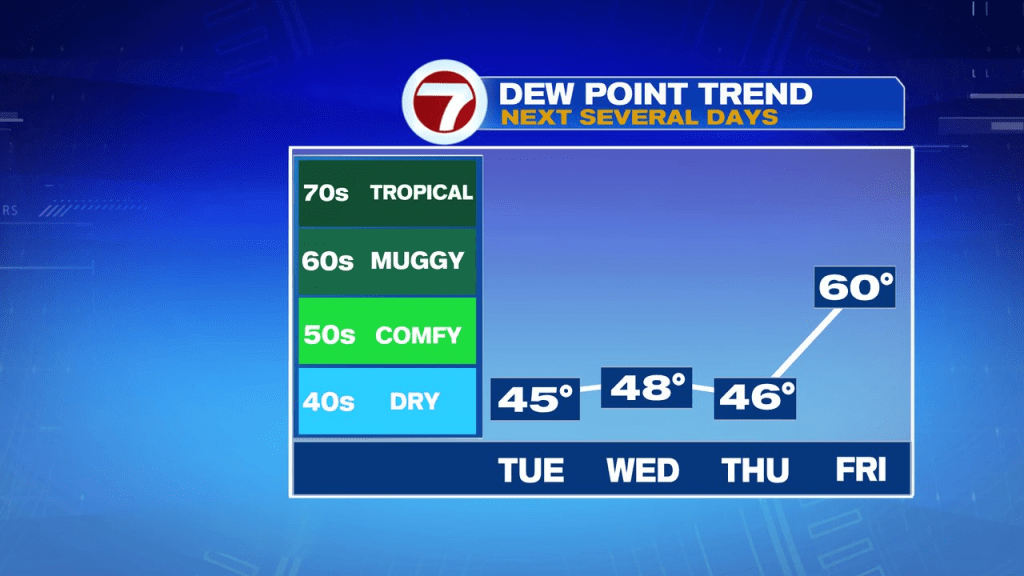 The highest rain chance this weekend is with showers and storms Friday into Friday night. We’ll catch a brief jump in humidity then too.