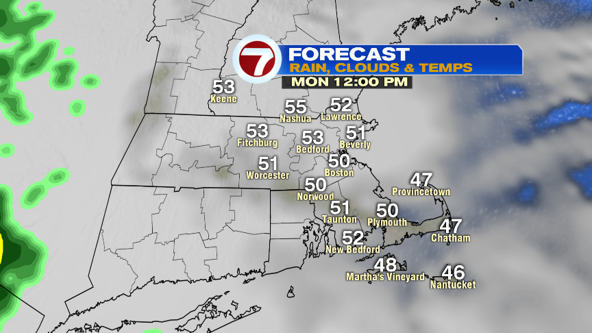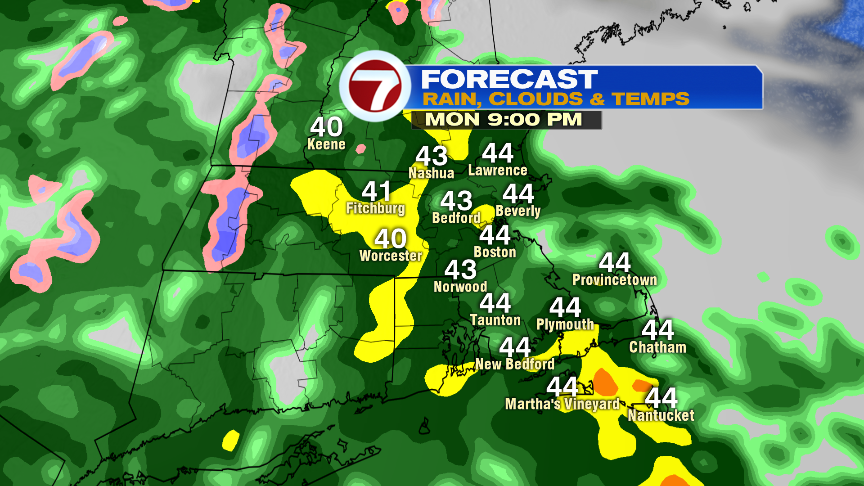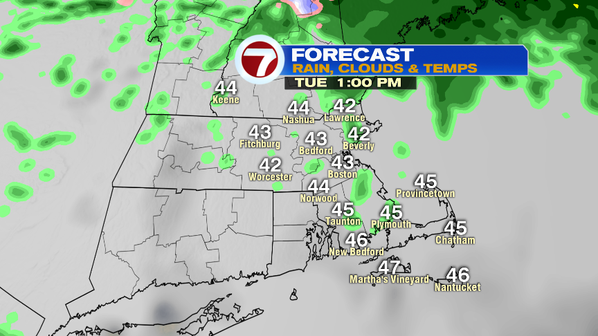 By tomorrow morning, the steadiest rain tapers to scattered showers and drizzle. It’ll be a damp and dreary day with highs only in the 40s.