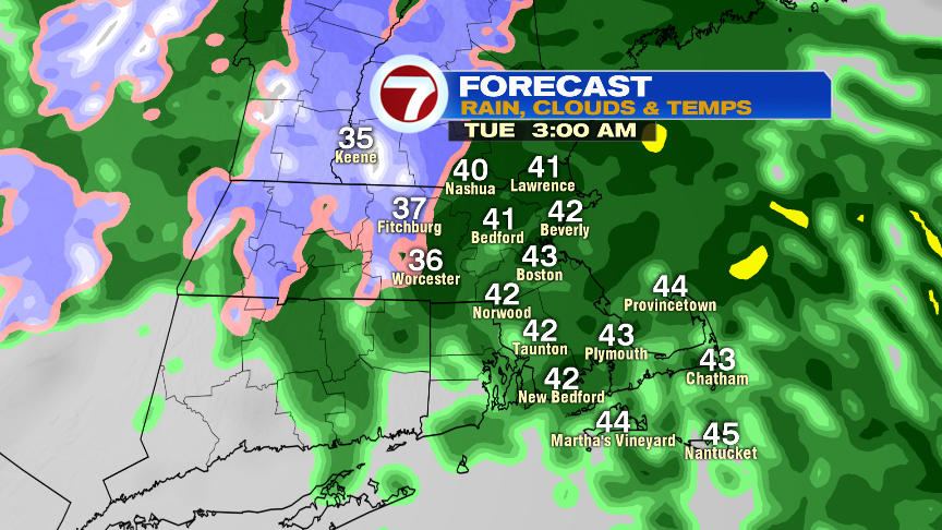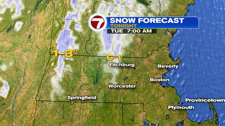 Above 1000 feet in the central and northern Worcester Hills, wet snow likely mixes in tonight as temps cool into the mid 30s. From Hubbardston to Westminster to Ashburnham, slushy coatings of snow are possible overnight. In the Berkshires, above 1500 feet, 1-3″ of snow is possible with even more likely above 2000 feet in elevation across VT and NH.