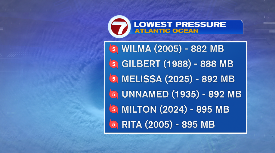Pressure is the most common way to measure the strength of a storm — not just a hurricane, but any storm like nor’easters or a simple, weaker winter Alberta clipper. The lower the pressure, the stronger the storm. The stronger the storm, the stronger the wind speed. So with the wind speeds produced by Melissa, it’s no shock that the pressure is in rare company. It’s a little reverse thinking because a lower pressure (a lower number) will put the storm higher on the list. Melissa is tied for third place for strongest hurricane on record in the Atlantic — again, this is by the pressure benchmark.