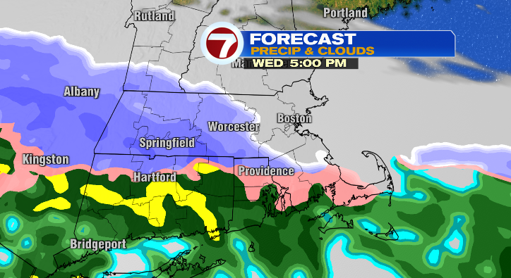 First, let’s begin with Wednesday. There’s a chance for some isolated rain or mix in the morning but the widespread precipitation doesn’t start until the afternoon. At first it begins around central and southern Massachusetts and takes more time to move north and east.