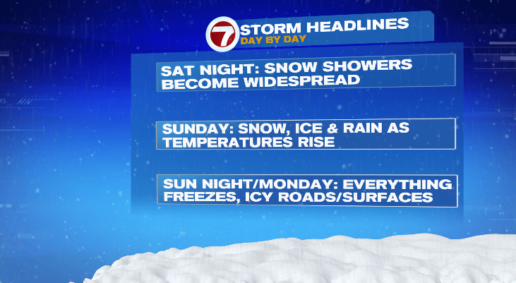 The snow becomes heavier and more widespread past 10 p.m. and that will churn overnight. However, toward early Sunday morning, we will see a change in precipitation. That change from snow to a wintry mix, sleet and freezing rain will happen first from the south as early as 2/3 a.m. for the islands. As the morning progresses, that sleet and freezing rain line will advance north. Eventually, areas farther south than that, will make the switch over to plain rain.