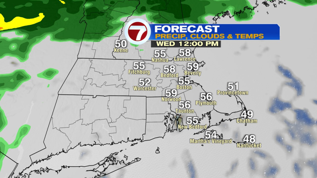 This evening, we’ll start tracking steady rain moving in from west to east. The heaviest rain, with some rumbles of thunder, falls in the 9pm-4am window for most, with a lot of the rain offshore by the morning commute Thursday with the exception of a few heavier showers lingering through sunrise across Southeast Mass, especially over the Cape and Islands. Overall rain totals reach 0.75-1.50″. That, combined with melting snow/ice piles, will create a lot of big puddles on the road and standing water in poor drainage areas. Temps stay lofty tonight too on a gusty southerly breeze, 30-50mph, strongest near the south coast.
