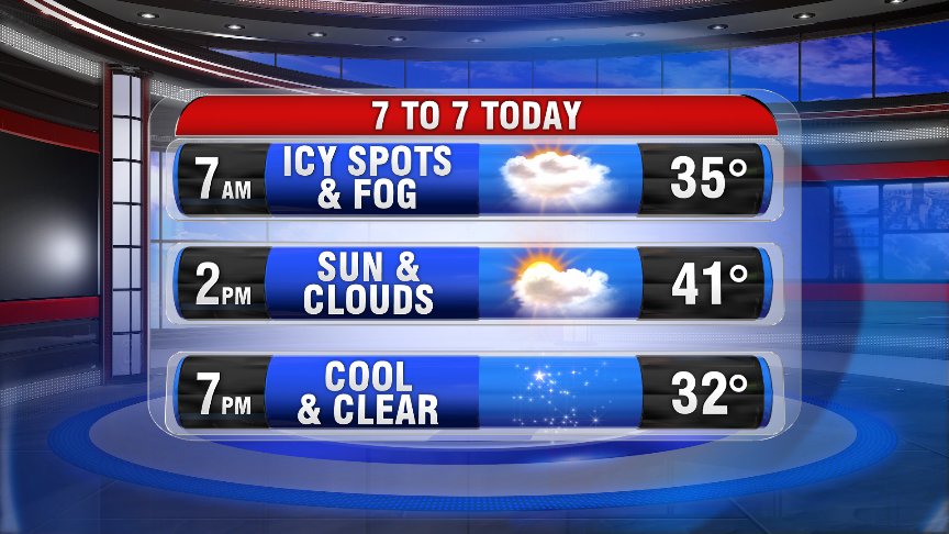 Greatest threat for icy roads will be NW of I-495. As temperatures continue to fall this morning,we’ll keep the risk for a few icy spots through the morning hours. Temperatures this afternoon are in the upper-30s and low-40s for most of the Bay State.