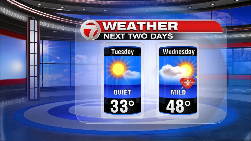 As high pressure moves into the region from our west today, we’ll gradually chip away at our cloud cover. By tomorrow, it’s nothing but sunshine and light winds. As this area of high pressure tracks offshore, return flow out of the southwest heats things up for your Valentine’s Day Forecast!
