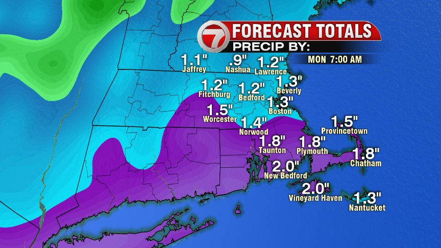 Generally rain totals add up to 1-2″ as a widespread range, but even a few locations along the south coast could be locally higher. Most rivers and streams should hold up ok since there’s not much snow melt to go with this round, however, do expect some big puddles out there on the roads with some localized street flooding a possibility.