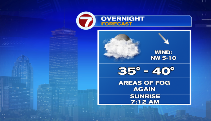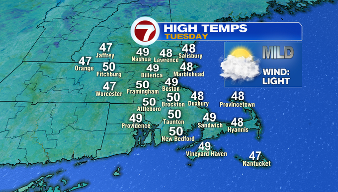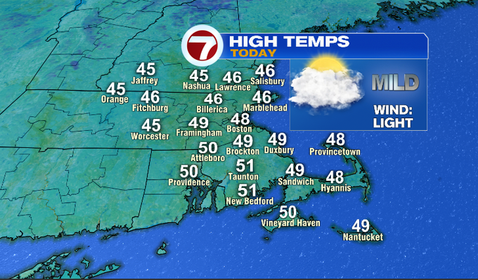 Temperatures are mild start to finish today. With all the cloud cover overnight, our temperatures held in the upper 30s/low 40s. We’ll reach the upper 40s/low 50s. The fog should lift by mid-morning, then we’ll still see a lot of clouds today. There could be some breaks of sun later today, but clouds win out.