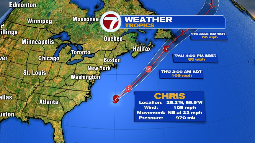 South side of Nantucket and the Vineyard will run a rip current risk today and tomorrow, and more of eastern Mass will see an increased risk of rip currents tomorrow. All courtesy of Hurricane Chris, which is a Cat 2 this morning.