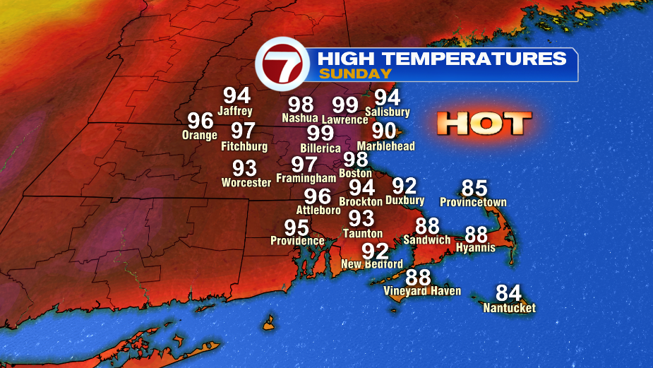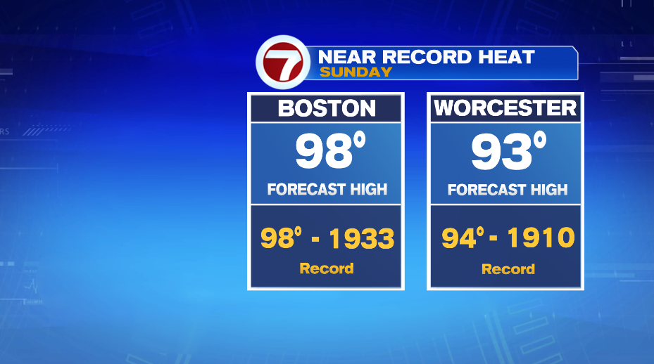 We’ll be challenging record high temperatures Sunday in both Boston and Worcester. Highs will be between 95-100º across most of the area.