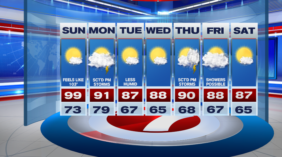 That front drops humidity on Tuesday. Highs are in the mid and upper 80s and it is mostly sunny. Wednesday also has sunshine and highs in the mid and upper 80s.