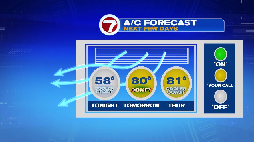 You don’t need the AC tonight with comfy and cool conditions. Wednesday and Thursday are “your call”. Both days have temperatures near 80º, and humidity is low.