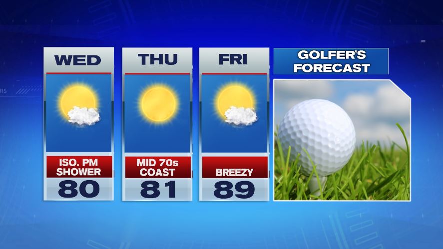 The golfer’s forecast is looking good! The next two days will have refreshing air, especially in the evenings. An onshore breeze kicks in on Thursday, meaning the coast will be a bit cooler, in the mid 70s. Friday is warmer with highs in the upper 80s, but humidity remains low.