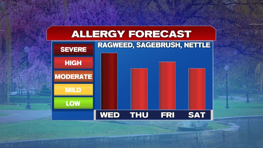 The allergy forecast is up to severe on Wednesday, and high Thursday – Saturday for ragweed, sagebrush, and nettle.
