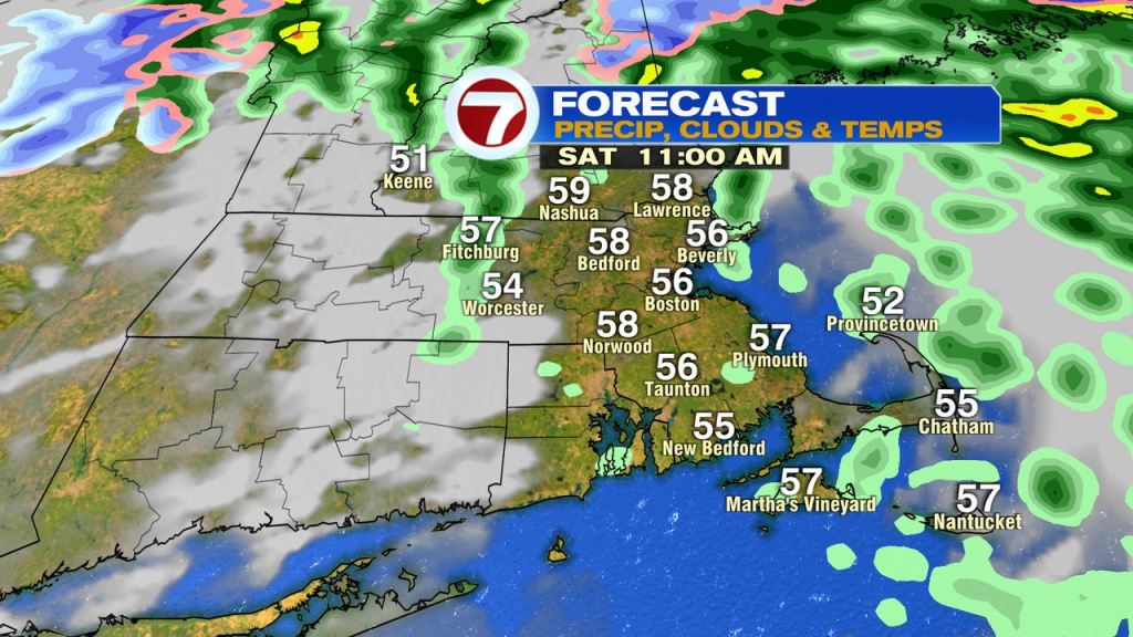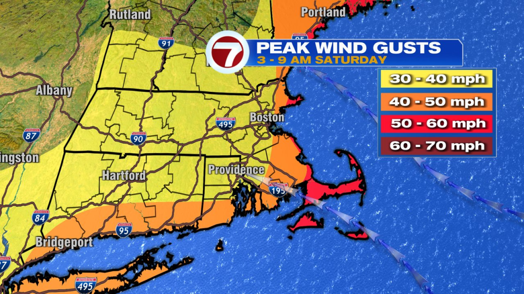 The strongest winds run through here between 3 a.m. – 9 a.m. Saturday, with gusts of 45-55mph along the coast. A few gusts to 60mph are possible for Cape Ann and the Cape and Islands.