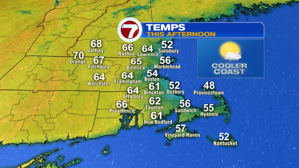 Today, the theme is similar. We’ll have some clouds mixed in with the blue skies and it’ll be a bit cooler with more of an easterly breeze, but the overall theme of another nice day is there. Temps this afternoon range from the low 50s at the coast to low to mid 60s inland.