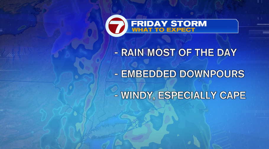 A few scattered showers will start to move in around midnight Thursday night going into Friday morning. The steadier and heavier rain will basically be a daylight storm — starting around or shortly after sunrise and continuing to just before sunset. During the day we’ll not only have rain, but embedded downpours as well. The rain will clear just before sunset, like 3 or 4pm, with maybe an isolated rain or snow shower hanging around through the evening.