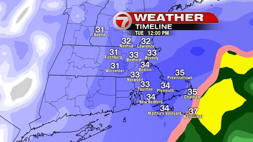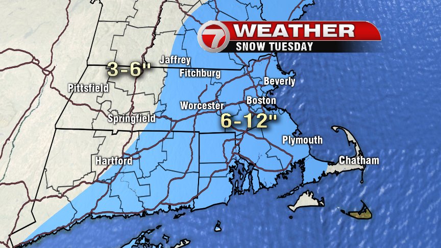 Snow and rain showers start Monday night and flip over to all snow by predawn Tuesday morning and continues as all snow for most of us through the day Tuesday. The Outer Cape and Nantucket may continue with mixing issues for a while Tuesday pending track of storm. The snow will be heaviest Tuesday morning until early Tuesday afternoon. Mid afternoon to early evening, snow intensity tapers to lighter snows from south to north.