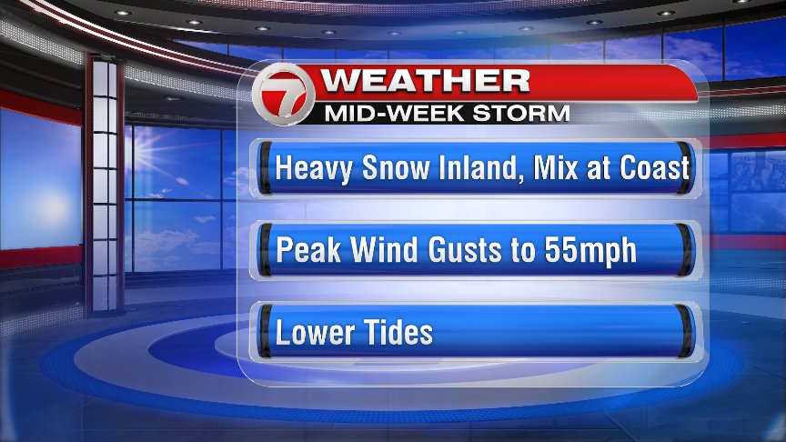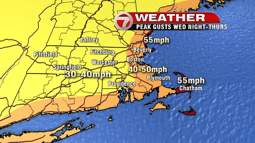The heaviest snow looks to fall past 6PM into the overnight hours Wednesday night. Winds will be strong across the coastline, with gusts of 40-50mph, and peak gusts of 55 mph for part of Cape Ann, the middle and lower Cape, as well as Nantucket. Power outages will again be a threat with strong winds (but fortunately we still won’t deal with as strong of wind gusts as last Friday’s Nor’easter)! Areas inland won’t deal with as strong of gusts, but they will see a major dose of heavy wet snow, which will likely weight down power lines and tree limbs. The combination of blustery winds inland combined with the heavy, wet snow will also likely lead to power outages.