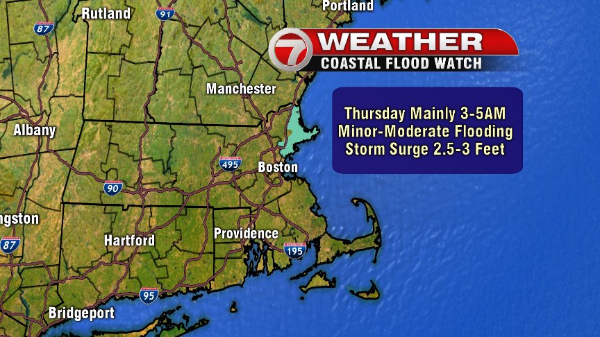 Tidal concerns revolve around one tide cycle…EARLY Thursday morning. This bring the risk for minor to moderate coastal flooding for the North Shore, and minor coastal flooding concerns for the south shore and Cape.