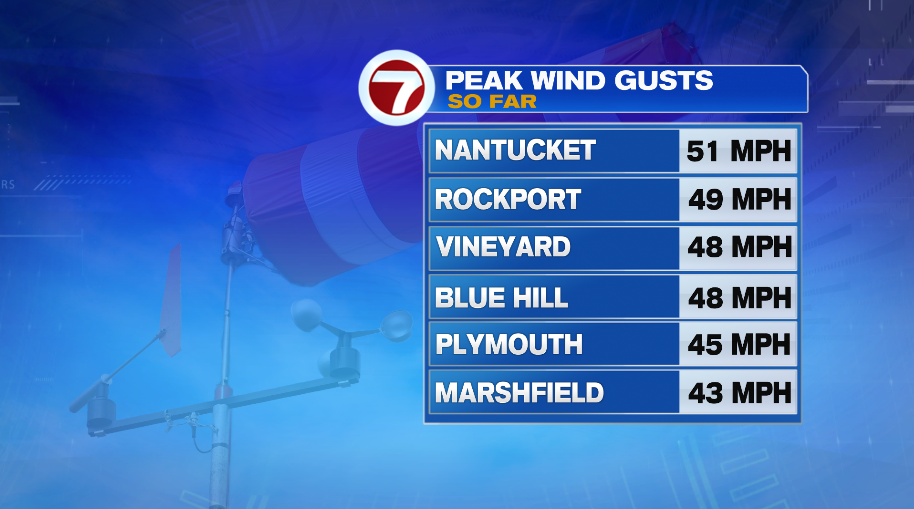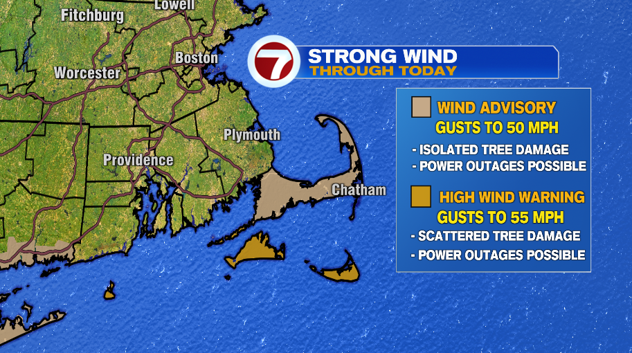 We have a wind advisory and high wind warning in effect for the day today for the continued risk of these strong winds. The Islands have the potential to gust up to 55 mph and the Cape to 50 mph. That’s where the wind headlines are in effect. Elsewhere, will be a windy day with coastal Massachusetts seeing wind gusts in the 40-45 mph range and interior Massachusetts gusting 30-40 mph.