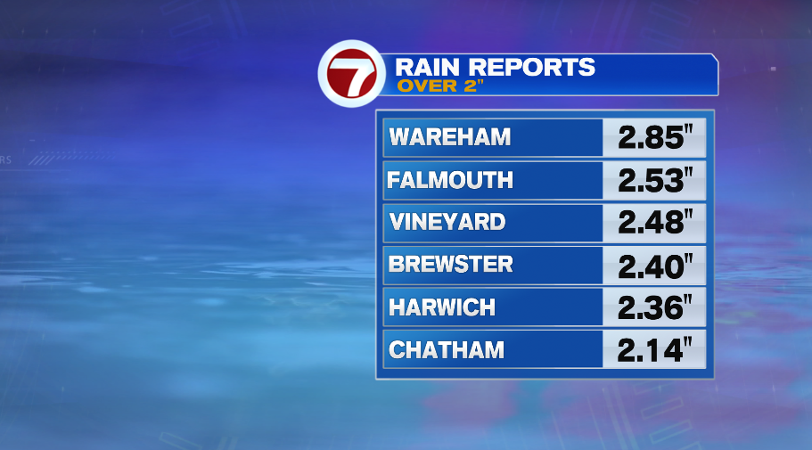 We’ll start with the rain. Rain started Sunday mid to late morning across the Cape and Islands and made an incredibly slow progression to the north during the day. The rain, of course, continues to fall and will (in some form) through Tuesday. Where the rain started earlier, rainfall reports are highest. A few 2″+ reports are starting to trickle in, especially across the Cape and South Coast. This 2″ + list is as of the writing of this blog (about 6am). In general, towns south of the Pike have seen 1-2″, and communities north of the Pike 1/2 – 1″.