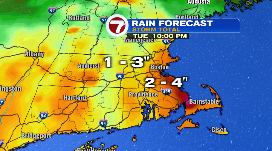 As rain continues to fall today and through Tuesday, rain tallies will continue to climb. In general, I think most towns fall in the 1-3″ range but coastal Plymouth county and parts of the Cape could see as much as 4-4.5″. That sounds like a lot (it is a lot), but keep in mind it’s falling over two and a half days so the flooding risk remains low. More than anything, it’s probably urban and poor drainage flooding we’d be concerned about, especially if the storm drains get clogged with leaves that have fallen either naturally, or by the wind we’ve seen in the last day.