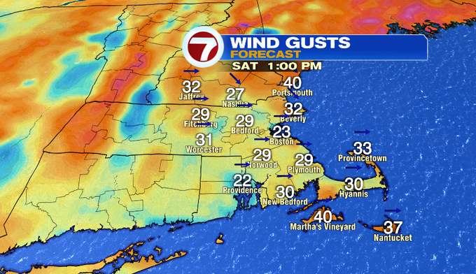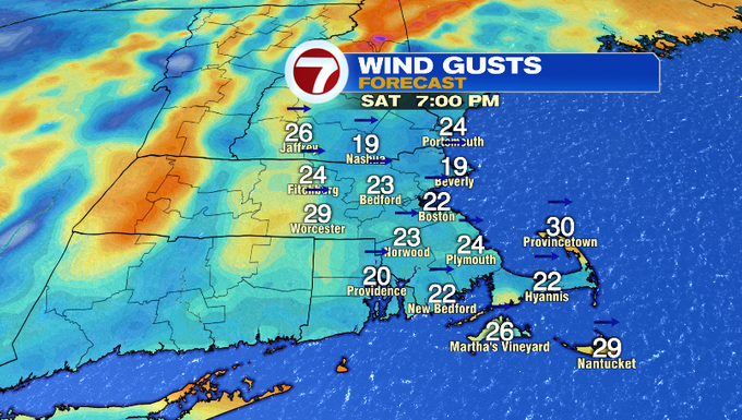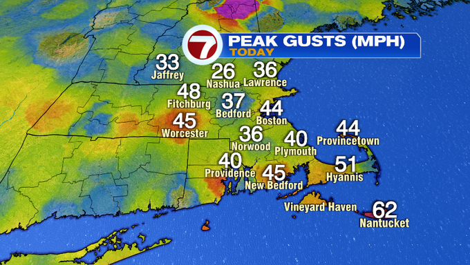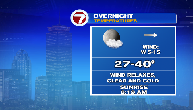 Most of today it stays windy with gusts near/above 30 mph for a lot of us. Some occasional gusts to 40 mph are possible. This evening the wind won’t be as strong, and the wind will relax overnight, especially inland.