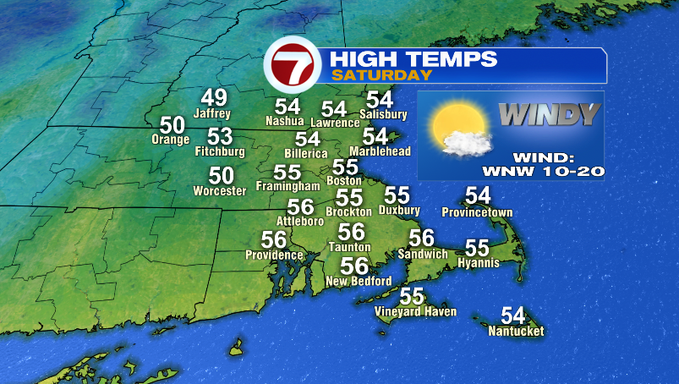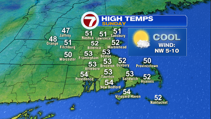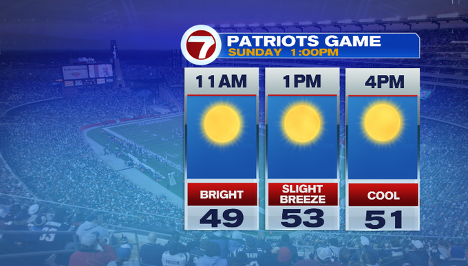After the cold start, it’s another cool day tomorrow. Highs will mainly be in the low/mid 50s under mostly sunshine. There will be less wind too. Another perfect football forecast at Gillette!