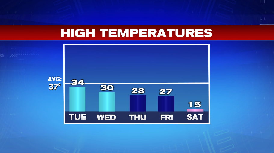 Temperatures only go down from here, sadly. Tomorrow is back to the winter chill with temperatures that only make it to about 30° but also the return of the breeze that’ll make it feel closer to 20°. That is just the beginning of our cool down… bundle up, it’s another bitter blast this weekend!