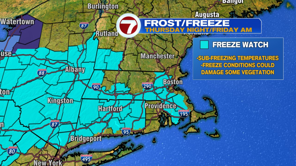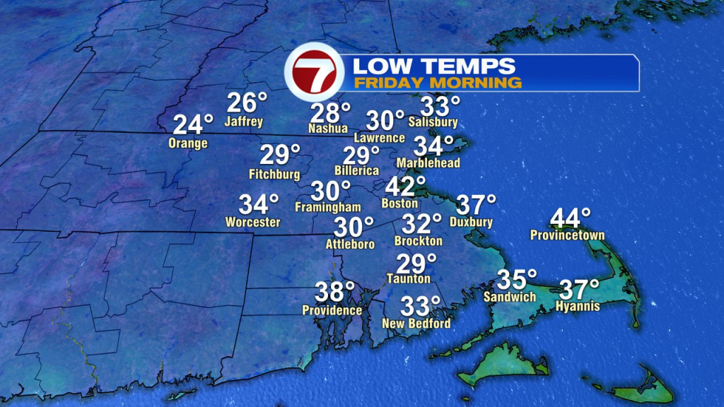 The coldest air of the season settles in tomorrow night with Friday morning lows starting off in the upper 20s and low 30s for many. A freeze watch is up for interior eastern Mass, where the growing season is ongoing, but will likely end. No freeze watch is up deeper inland because the growing season is already done, although, it’ll be just a cold there.