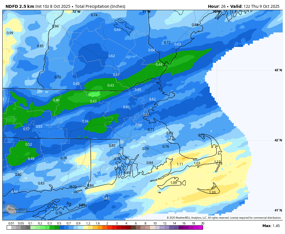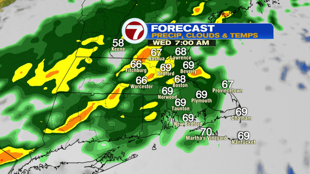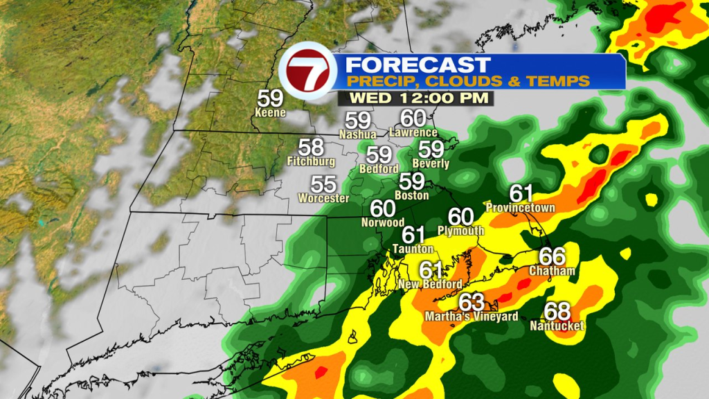 While it’s a very mild and muggy start to the day with temps running near 70 early, change is on the way. Showers become more widespread this morning, dampening the morning commute for many. As the rain kicks in, winds will shift direction and temps will slide back to near 60 by noon. While the rain is widespread this morning, it will taper off around midday. We’ll dry out from northwest to southeast from late morning through mid afternoon with the latest to see the wet weather taper off, down near the south coast. The evening commute will be better, as sunshine returns mid to late afternoon and we dry out. Most towns and cities end up picking up about 1/3 to 2/3rds of an inch of rain with locally higher totals across Southeast Mass.