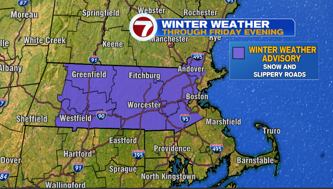 But first, the snow! A Winter Weather Advisory is in place for a large portion of Massachusetts outside of the coast and SE Mass, as a system moves through tomorrow touching off rain and snow showers. It will make for slippery roads for the morning and evening commutes. Expect a coating to an 1″ for areas generally within the 495 corridor to the coast. Along 495 and west to the Worcester Hills, accumulations will be 1-3″, with localized amounts up to 4″.