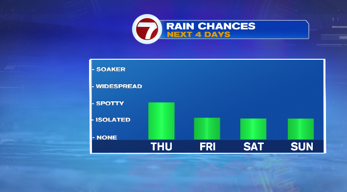 In terms of rainfall the rest of the week, we’ll have a few chances, but none look as solid as Thursday’s. We could see a spotty shower or two Friday and Saturday, but most of both days stays dry.
