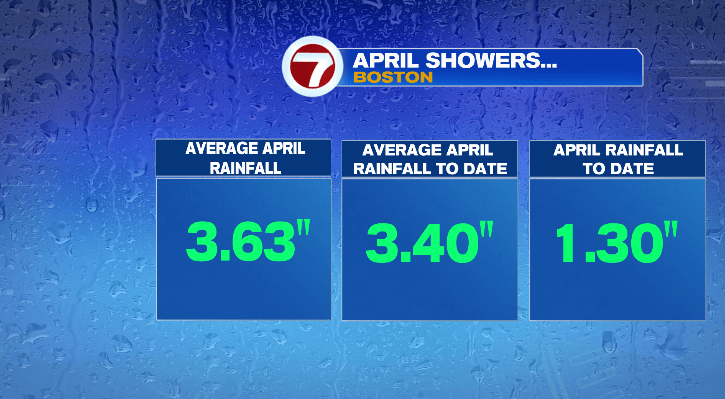 Overall, we’re largely looking at rainfall amounts between 0.10″ – 0.50″. It’s not record-setting but it is impactful… in fact, it’ll actually be helpful for some areas, as right now Southern New England is running a bit dry. The North Shore, Cape and Nantucket in particular are lacking when it comes to rainfall, but most of the state could use the rain at this point. One example is the greater Boston area– Logan Airport generally sees 3.63″ of rain in the month of April. We should have seen 3.40″ by this point in the month. However, we haven’t even seen 2″ of rain! We haven’t even seen 1.50″! Logan is just one of many examples measuring low.