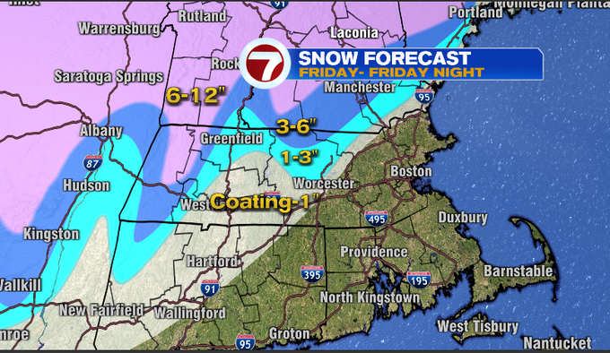 The storm track right across New England will promote an east wind that promotes milder air off the ocean. (For snow lovers, you would want that storm track east of Nantucket). So that’s why we’re expecting a mainly rain event. It’ll be rain within the 495 corridor. It will be a snow/mix/rain event for areas west of 495. This will be great for ski country! As where you see areas shaded in white, this event will be mostly snow. We think for areas north and west of Fitchburg, to Keene and Jaffrey, there will plowable, accumulating snow. Friday night into Saturday, the tail-end changes back to light snow. There could be a coating to an inch for the suburbs outside of 495.