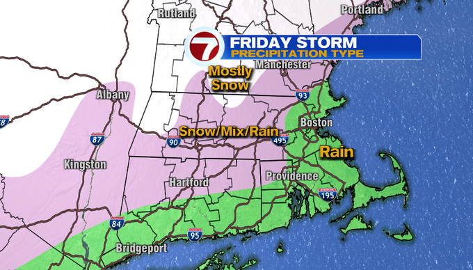 Here’s the timeline for the rain and snow. Rain and snow begins to move in after midnight Friday. Expect rain for the Friday AM and PM commutes for MetroWest. Friday night into Saturday, the tail-end changes back to snow for areas west of 495.