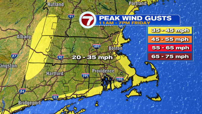 The storm will kick up the wind Friday. It’ll be more of a nuisance wind for most locations late morning into the evening. Along the coast and Berks, the wind will gust out of the E/NE 35-45 mph. Even though the wind will gust this high, power loss is not likely with this storm.