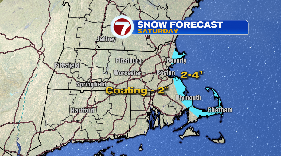 The snow showers Saturday are on-and-off, but since they’re around for most of the day, will still give us some minor accumulations. For most of us it’s an inch or two, but on the water’s edge, some ocean enhancement may boost those numbers just a bit.