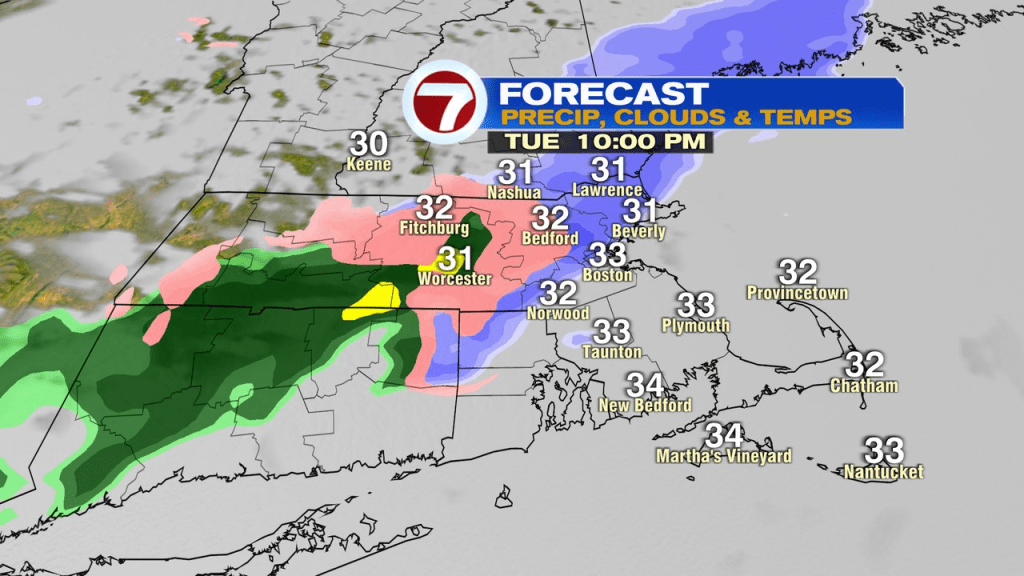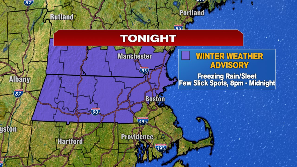 After the evening commute, the potential for slick spots develop on untreated surfaces, as some light sleet and freezing rain break out. The highest risk for a glaze of ice on the sidewalk/driveway or untreated road, favors locations north and west of Boston, in the 8pm – midnight timeframe. With that in mind, there is a winter weather advisory in place.