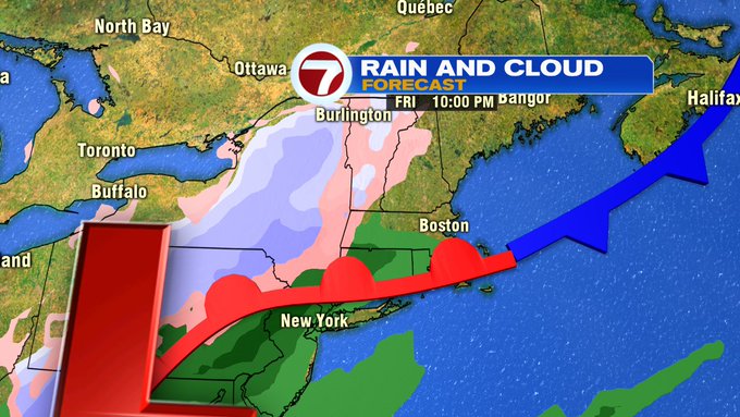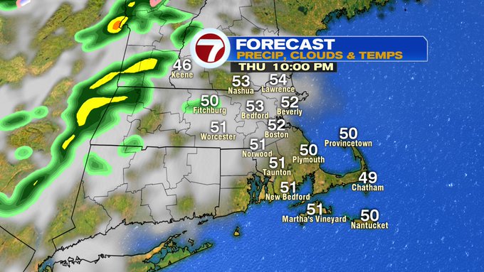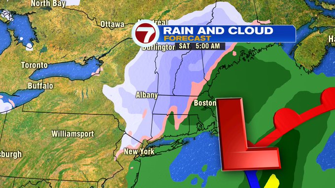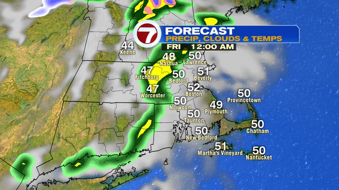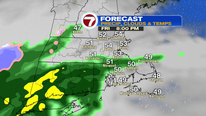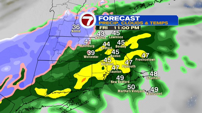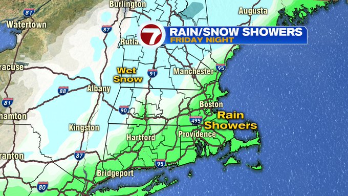 Friday evening, just after sunset, the leading edge of showers start to move in from the southwest. These continue to build in Friday night and into early Saturday morning, with a changeover to some wintry mix to snow for the higher elevations into western MA, southern VT, southern NH, and north central MA.