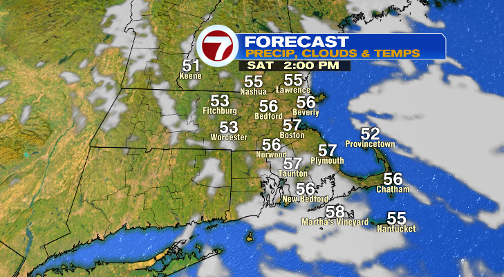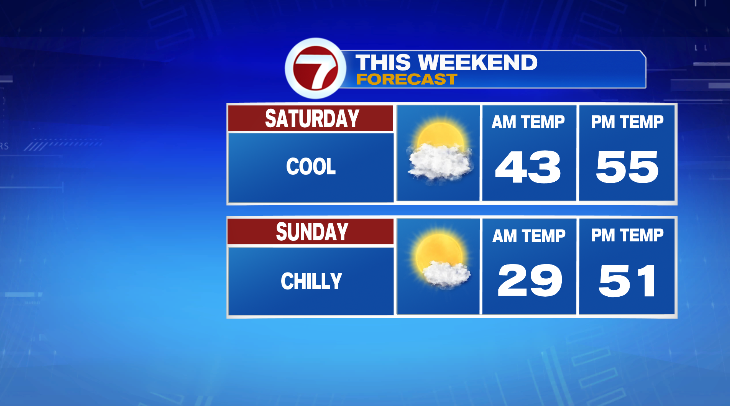 Early Saturday morning, lows will drop way down into the low 40s. Afternoon highs won’t make it out of the 50s. Skies will be dry and partly sunny.