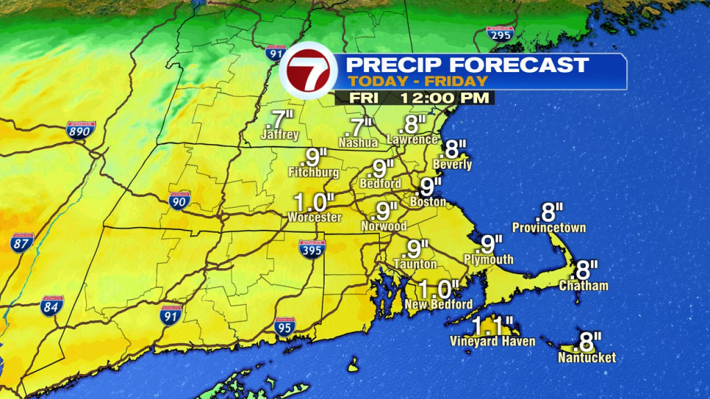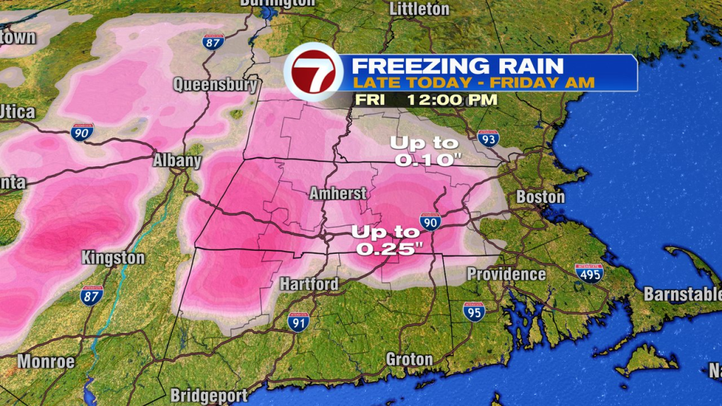 Snow/sleet totals run 2-4″ across northern MA and NH with lower amounts near the Pike. Freezing rain will push toward 0.25″ accretion in southern Worcester County.