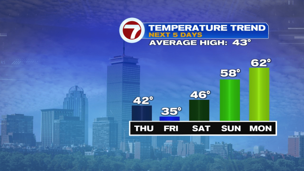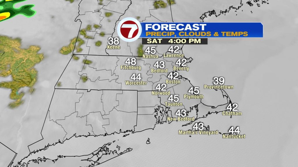 Saturday is mostly cloudy with temps in the 40s. A front comes through with a few showers Saturday night, then on the other side of it, we’ll be milder and a bit brighter on Sunday with highs well into the 50s.