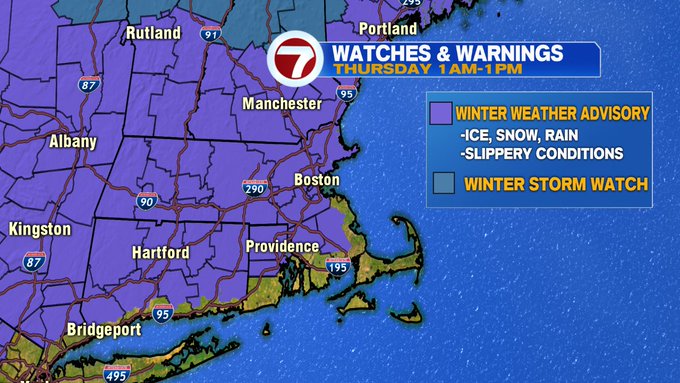 Expect a slow go on the roads for Thursday morning’s commute, especially inland where the snow and wintry mix will linger the longest. A Winter Weather Advisory has been issued for most of the Bay State and southern NH due to a mix of snow and rain that will result in some ice and snow accumulation and slick roads and sidewalks. The Winter Weather Advisory remains in effect from 1AM to 1PM for most, while for Western MA the Advisory remains in effect thru Thursday night.