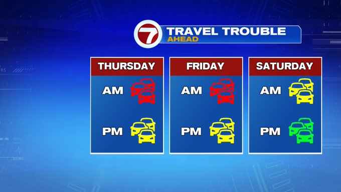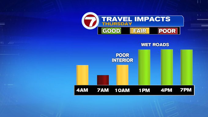 By 10AM, the temperatures warm-up, moving the rain/snow line even farther north. Just a few rain showers expected by late morning with temperatures into the upper 30s to low 40s. By Thursday evenings commute, a few spotty rain showers possible, with the heaviest rain holding off until late Thursday night into early Friday morning.