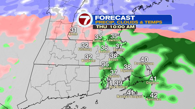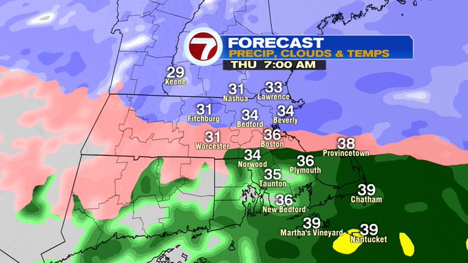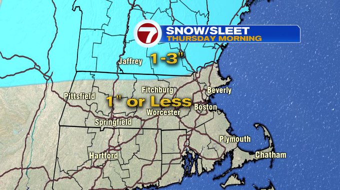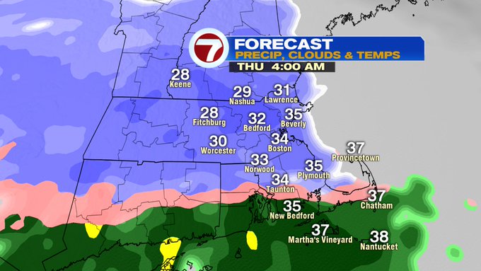 By 7AM Thursday, the rain/snow line will be along and south of the Pike – meaning along and north of the Pike expect some ice pellets to snow to the north, making for some slick spots and some snow covered roads especially in northern MA and southern NH, as well as the higher elevations.