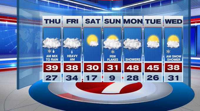 Drier conditions prevail Friday evening through Saturday. Saturday looks to be the coldest out of the next 7 days with highs around 30° but at least its under mostly sunny skies. We start off Sunday under a bitter cold airmass (in the single digits) before warming up around the freezing mark by Sunday afternoon. Don’t be surprised by a few snow flakes on Sunday during your travels. Then, we start off the next work week with a warm-up and showers Monday. Still mild, but dry Tuesday, with just a few snow showers early next Wednesday.