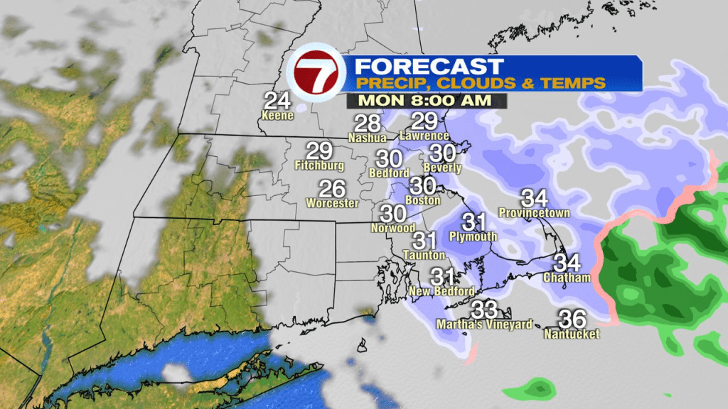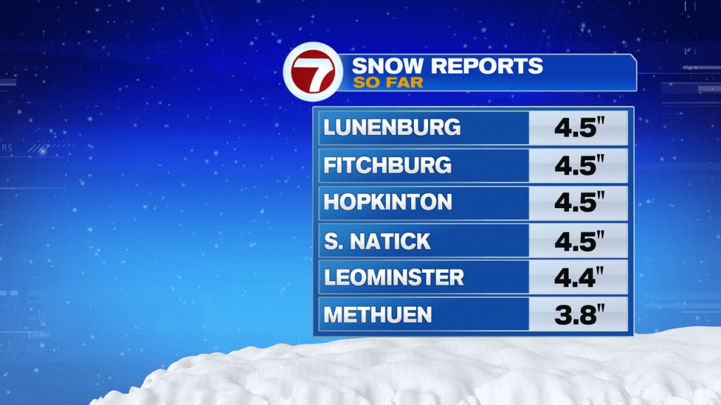 With snow falling pretty much all night, many of us wake up on this Monday morning with a fresh 4-6″ on the ground. It tends to be a fluffier snow northwest of Boston and a sticker snow across Southeast Mass.